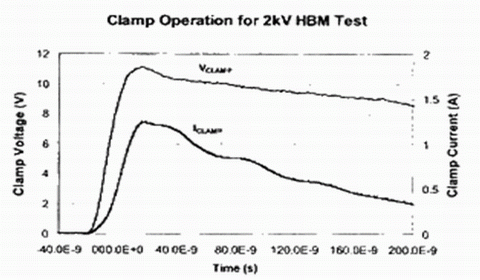 大電流在ESD二極管和引線上產(chǎn)生I-R壓降,該電壓高于二極管本身的壓降。IC可靠性報告中給出了器件設(shè)計所能承受的ESD測試電壓。