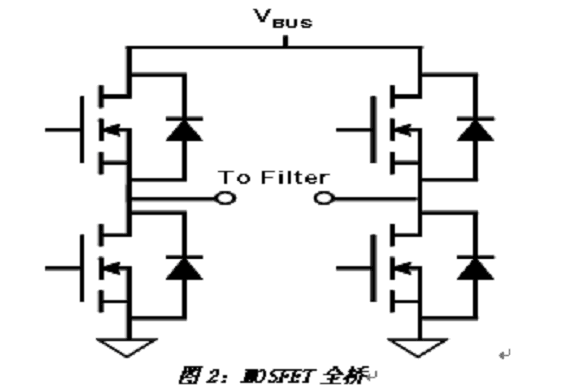 濾波之后,輸出橋產(chǎn)生一個50Hz的正弦電壓及電流信號。一種常見的實現(xiàn)方案是采用標(biāo)準(zhǔn)全橋結(jié)構(gòu) (圖2)。圖中若左上方和右下方的開關(guān)導(dǎo)通,則在左右終端之間加載一個正電壓;右上方和左下方的開關(guān)導(dǎo)通,則在左右終端之間加載一個負(fù)電壓。