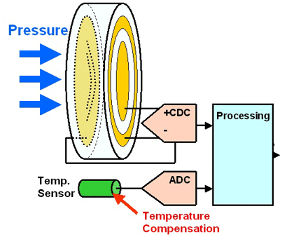 由于熱擴(kuò)散,溫度傳感器需要考慮改變的幾何形狀。設(shè)想兩個(gè)電極中的一個(gè)附著在芯片上,另一個(gè)附著在由金屬或陶瓷構(gòu)成的支架上,因此支架自己作為傳感器。以陶瓷為例,能夠承受非常高的壓力和侵入的媒介。與經(jīng)典的惠斯通電橋相比較,電容壓力傳感器的主要優(yōu)點(diǎn)是對輸入電流的要求更低,使得他們特別適合于諸如輪胎壓力控制之類的應(yīng)用。