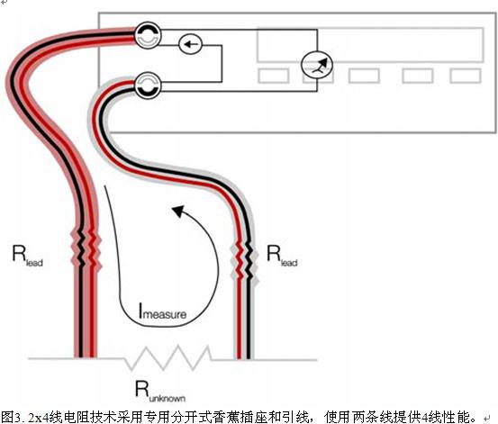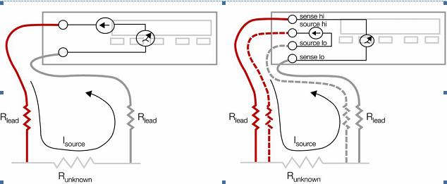 源端引線(xiàn)中的串聯(lián)電阻不影響電流流動(dòng)。測(cè)量/傳感引線(xiàn)幾乎沒(méi)有電流流動(dòng),因?yàn)閮x表的輸入阻抗很高。這意味著測(cè)量引線(xiàn)中沒(méi)有I x R電壓下跌。因此,您只需測(cè)量由于流經(jīng)的源電流而在未知電阻器中產(chǎn)生的電壓下跌。