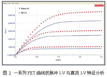 利用這種工具套件,研究人員可以同時(shí)進(jìn)行直流和脈沖IV測試以掌握器件特性,例如如圖2所示的FET器件系列特征曲線。
