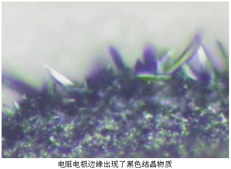 有一批現(xiàn)場(chǎng)儀表在某化工廠使用一年后,儀表紛紛出現(xiàn)故障。經(jīng)分析發(fā)現(xiàn)儀表中使用的厚膜貼片電阻阻值變大,甚至變成開路了。把失效的電阻放到顯微鏡下觀察,可以發(fā)現(xiàn)電阻電極邊緣出現(xiàn)了黑色結(jié)晶物質(zhì),進(jìn)一步分析成分發(fā)現(xiàn),黑色物質(zhì)是硫化銀晶體。原來電阻被來自空氣中的硫給腐蝕了!