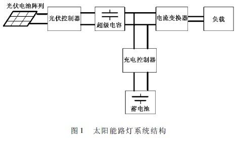 太陽(yáng)能路燈系統(tǒng)在道路照明中有很高的價(jià)值。使用超級(jí)電容的太陽(yáng)能LED路燈系統(tǒng)屬于復(fù)合能源系統(tǒng),該系統(tǒng)中的電能傳輸需要在線控制以保證系統(tǒng)的正常運(yùn)行。圖1為超級(jí)電容的太陽(yáng)能LED路燈的系統(tǒng)結(jié)構(gòu)??刂破髯鳛楹诵牟考芾碇鱾€(gè)部件之間的能量傳輸。為保證蓄電池充放電可靠、高效,同時(shí)滿足照明需求,控制器需要對(duì)系統(tǒng)中的電能進(jìn)行管理。在弱太陽(yáng)光照的情況下,由于光伏電池產(chǎn)生的能量不穩(wěn)定,不能有效的對(duì)蓄電池充電。