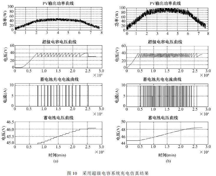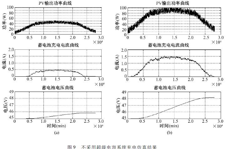 對(duì)比兩種系統(tǒng)結(jié)構(gòu),從蓄電池最終電壓可以看出,弱光照情況下,使用超級(jí)電容系統(tǒng)的光伏電池的利用率上升,蓄電池電壓變化值約為不采用超級(jí)電容的蓄電池電壓變化值的120%,即在弱光照下,系統(tǒng)的光伏發(fā)電效率提高了大約20%。而在晴天,有足夠光照的情況下,雖然在早晚光照較弱時(shí),其發(fā)電能力得到提高,但由于多引入一級(jí)變換器,在較高功率下,采用超級(jí)電容沒(méi)有對(duì)系統(tǒng)的發(fā)電效率有明顯的提高。由上,采用超級(jí)電容的獨(dú)立光伏系統(tǒng)在光照不足的地區(qū)能對(duì)發(fā)電能力有明顯的改善。