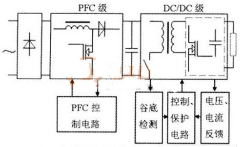 所研究的開(kāi)關(guān)電源結(jié)構(gòu)如圖1所示,采用兩級(jí)PFC結(jié)構(gòu),由PFC預(yù)變換器、隔離變換器和同步整流電路組成的DC/Dc變換器以及檢測(cè)與保護(hù)電路組成。交流電壓經(jīng)整流后先輸入到PFC預(yù)變換器進(jìn)行功率因數(shù)校正變換,再由電源控制電路控制隔離變換器,將直流電壓轉(zhuǎn)換成高頻交流脈沖電壓,此脈沖電壓經(jīng)同步整流器整流、濾波電路濾波后,得到所需的直流。