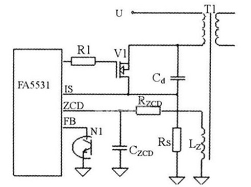 功率隔離變換器電路如圖5所示,由控制電路和反激式變換器組成。圖中,變壓器輔助繞組LZ、電阻RZCD、電容CzcD組成谷底探測(cè)電路,為控制芯片F(xiàn)A5531提供谷底檢測(cè)信號(hào)。光電耦合器N1次級(jí)將輸出電壓反饋信號(hào)輸入控制芯片。電路啟動(dòng)后,F(xiàn)A5531輸出驅(qū)動(dòng)信號(hào)使V1導(dǎo)通,V1電流上升,此電流由Rs檢測(cè)輸入到控制芯片的IS引腳,與由反饋輸入FB引腳的電壓決定的參考電壓進(jìn)行比較,達(dá)到參考電壓時(shí),V1關(guān)斷,變壓器繞組電壓反相,變壓器初級(jí)電感向次級(jí)負(fù)載饋送能量。當(dāng)向次級(jí)饋送能量過(guò)程結(jié)束時(shí),次級(jí)電流下降到零。變壓器漏感與開(kāi)關(guān)管寄生電容Cd構(gòu)成了諧振電路,變壓器輔助繞組感應(yīng)此諧振電路的諧振電壓,并輸入到FA5531P的ZCD引腳。當(dāng)次級(jí)電流下降到零時(shí),諧振電路的諧振電壓迅速下降,輔助繞組的感應(yīng)電壓也迅速下降,當(dāng)ZCD引腳上的電壓降至谷底探測(cè)閾值時(shí),F(xiàn)A5531P驅(qū)動(dòng)輸出使V1重新導(dǎo)通。由于電阻RzcD、電容CzcD會(huì)引入延時(shí),選擇合適的RzcD、CzcD值,就可實(shí)現(xiàn)V1零電壓開(kāi)通。