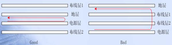 1.布線層的投影平面應(yīng)該在其回流平面層區(qū)域內(nèi)。布線層如果不在其回流平面層地投影區(qū)域內(nèi),在布線時將會有信號線在投影區(qū)域外,導(dǎo)致“邊緣輻射”問題,并且還會導(dǎo)致信號回路面積地增大,導(dǎo)致差模輻射增大。