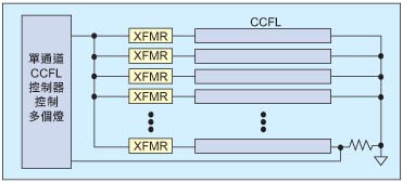 CCFL已在筆記型電腦、數(shù)位相機(jī)、導(dǎo)航系統(tǒng)以及其他具有較小LCD螢?zāi)坏脑O(shè)備中使用多年。這些類型的設(shè)備通常只用一個(gè)CCFL,因此,傳統(tǒng)設(shè)計(jì)只用一個(gè)CCFL控制器。隨著大尺寸LCD面板的出現(xiàn),帶來對多CCFL的需求,有必要采用新的方式來應(yīng)對這種新的需求??赡艿姆绞街皇遣捎靡粋€(gè)單通道CCFL控制器來驅(qū)動(dòng)多個(gè)燈(圖5)。這種方式中,CCFL控制器只透過其中的一個(gè)燈來監(jiān)測燈電流,而以幾乎相同的交流波形同時(shí)驅(qū)動(dòng)所有并聯(lián)的燈。然而,這種方式存在著幾個(gè)缺陷。