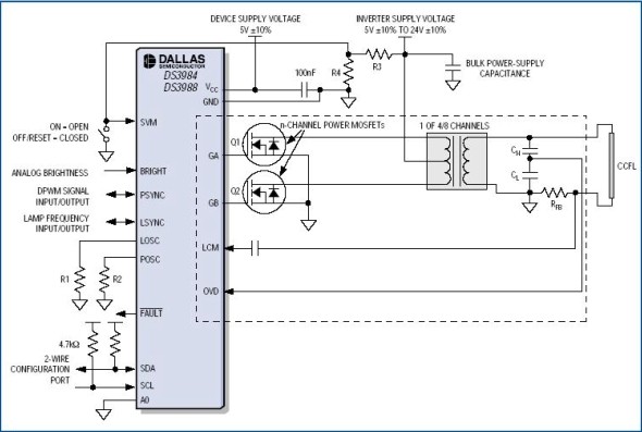 DS3984(四通道)和DS3988(八通道)CCFL控制器解決了本文所提到的所有這些設(shè)計(jì)挑戰(zhàn)??蓪⑦@些元件配置為每個(gè)通道驅(qū)動(dòng)一個(gè)燈(圖6),或者每通道多個(gè)燈(圖7),用戶可靈活裁減設(shè)計(jì),以滿足自己的性價(jià)比目標(biāo)。多個(gè)DS3984/DS3988可輕松串聯(lián),以支援任意數(shù)量的燈來為LCD電視螢?zāi)惶峁┍彻狻?br />
