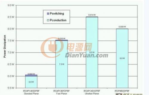 在20kHz下,開關損耗明顯成為總功耗的重要部分。同時,標準速度IGBT的導通損耗雖然最低,但其開關損耗卻最大,并不適合充當高壓側(cè)IGBT。