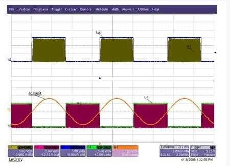為滿足這個要求,IGBT可在20kHz或以上頻率的情況下,對50Hz或60Hz的頻率進行脈寬調(diào)制,因此輸出電感器L1和L2便可以保持合理的小巧體積,并能有效抑制諧波。此外,由于其轉(zhuǎn)換頻率高出人類的正常聽覺頻譜,因此該設計也可盡量減少逆變器產(chǎn)生的可聽噪聲。