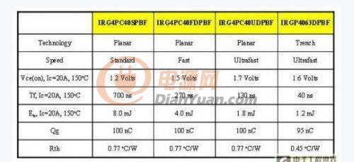 表1顯示了四個擁有相同尺寸的IGBT的參數(shù)值。前三個IGBT采用同樣的平面式技術,但使用不同的壽命復合控制計量。從表中可見,標準速度的IGBT具有最低Vce(on) ,但與快速和超速平面式IGBT相比,標準速度的IGBT下降時間最慢。第四個IGBT是經(jīng)優(yōu)化的槽柵IGBT,能夠為太陽能逆變器這類高頻率切換應用提供低導通和開關損耗。請注意,槽柵IGBT的Vce(on) 和總切換損耗 (Ets) 比超速平面式IGBT低。