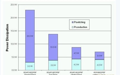 前文討論了高壓側(cè) IGBT在20kHz或以上頻率進行切換。假設設計一個擁有230V交流輸出的1.5kW 太陽能逆變器,表1中哪種IGBT具有最低的功耗呢?圖4顯示了IGBT在20kHz進行切換的功耗分析,由此可見超速平面式IGBT比其它兩種平面式 IGBT具有更低的總功耗。