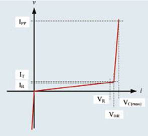 圖2 TVS線性化I-V特性曲線(單向TVS,陰極端子定義為陽(yáng)性)