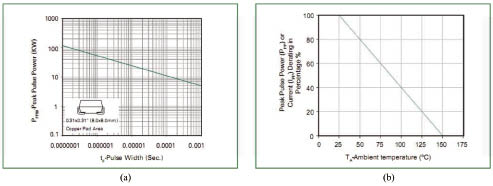 圖3 Littelfuse 5.0SMDJ15A TVS(a)峰值脈沖功率與脈沖持續(xù)時(shí)間,(b)熱降額特性