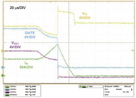 由于在檢測(cè)到故障之前允許建立起盡可能高的電流,圖1中電路的輸出兩端直接拉低的零阻抗短路尤其麻煩。在短路故障響應(yīng)時(shí)間之后,通路MOSFET最終是由“斷路器”故障條件下的熱插拔控制器命令關(guān)閉的,同時(shí)正向電流迅速被中斷。