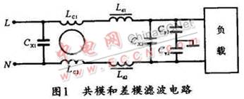 開(kāi)關(guān)電源的開(kāi)關(guān)頻率及其諧波的主要表現(xiàn)是電源線上的干擾,稱之為傳導(dǎo)干擾。傳導(dǎo)干擾分為共模干擾和差模干擾。共模干擾是由載流導(dǎo)體與大地之間的電位差產(chǎn)生的,其特點(diǎn)是兩條線上的干擾信號(hào)電壓是同電位同相的;而差模干擾則是由載流導(dǎo)體之間的電位差產(chǎn)生的,其特點(diǎn)是兩條線上的干擾信號(hào)電位相同,但相位相反。事實(shí)上,針對(duì)不同的干擾信號(hào),EMI濾波電路也分為抗共模干擾濾波電路和抗差模干擾濾波電路,圖1所示是其濾波電路。