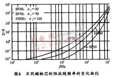 當(dāng)頻率在100 kHz~1 MHz頻段時(shí),鐵氧體材料Z急增,而金屬磁性材料和超微晶仍然平穩(wěn)上升,在1 MHzl/寸,進(jìn)口鐵氧體達(dá)到峰值,Z最大,說(shuō)明在這一頻段內(nèi),鐵氧體材料對(duì)干擾噪聲的抑制效果最好。所以,制造共模濾波器時(shí)所選用的電感材料一定要根據(jù)電路要求的抑制頻段范圍來(lái)選擇,這是非常重要的。同時(shí),從表1與圖3所示曲線對(duì)比可以看出,并不是電感量越高越好,而應(yīng)考慮它的電參數(shù),更不能簡(jiǎn)單用增加線圈匝數(shù)的方法來(lái)增加電感,因?yàn)檫@樣會(huì)增加高頻寄生電容。