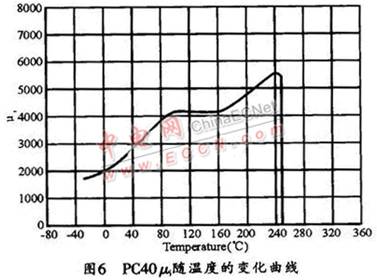 中小功率的EMI濾波器產(chǎn)品中選用最多的磁芯材料是日本TDK公司 的PC40 (它是目前業(yè)界廣泛使用的較好的材料之一),它的初始磁導(dǎo)μi隨溫度的變化曲線如圖6所示。從圖中可看出,溫度變化對(duì)μi的影響是很大的,磁芯溫度在 90~150℃的區(qū)間內(nèi),有一段平坦區(qū),這時(shí)它的μi大約在4100左右;當(dāng)溫度低于90℃后,μi值會(huì)隨著溫度的降低而逐漸減小,到0℃時(shí),μi值只有 2000左右,進(jìn)到負(fù)溫區(qū)后,μi值還會(huì)進(jìn)一步減?。欢?dāng)溫度高于150℃后,μi值則會(huì)隨著溫度的升高而增加,當(dāng)達(dá)到240℃時(shí),μ的最大值為5600 左右;從240℃開(kāi)始,μi值又漸漸減小,當(dāng)溫度達(dá)到居里溫度點(diǎn)250℃時(shí),材料失去磁性。