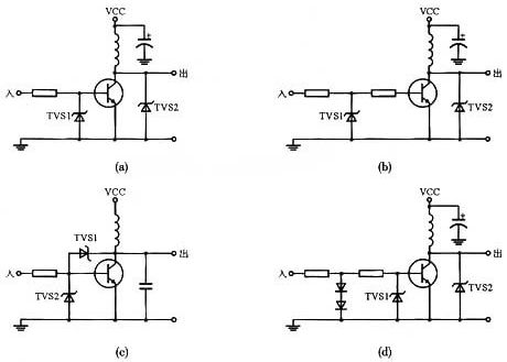 各種瞬變電壓能使晶體管的EB結(jié)或CE結(jié)擊穿而損壞,特別是晶體管集電極有感性(線圈、變壓器、電動機(jī))負(fù)載時,通常會產(chǎn)生高壓反電勢,因而可能使晶體管損壞。在實(shí)際應(yīng)用中,建議采用TVS作為保護(hù)器件。圖3所示為TVS保護(hù)晶體管的四種電路實(shí)例。