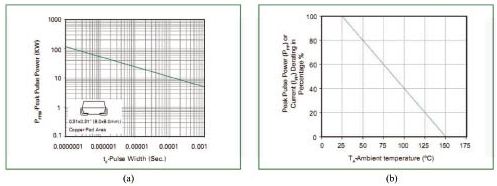 對瞬變電壓的吸收功率(峰值)與瞬變電壓脈沖寬度間的關(guān)系。手冊給的只是特定脈寬下的吸收功率(峰值),而實(shí)際線路中的脈沖寬度則變化莫測,事前要有估計。對寬脈沖應(yīng)降額使用。
