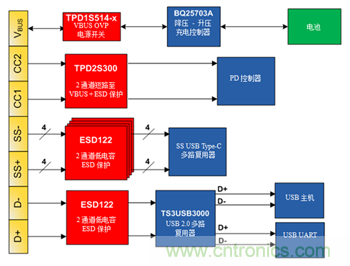 您可將TPD2S300與其他保護(hù)裝置(如TPD1S514(過壓+沖擊+VBUS的ESD保護(hù))和ESD122 (雙通道低電容ESD保護(hù)))配對,為USB Type-C連接器提供一體式解決方案(圖2)。
