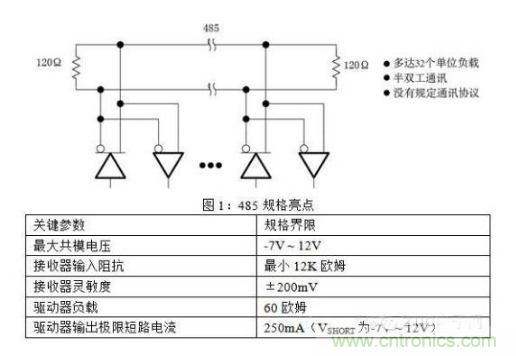 2.1.2單位負(fù)載概念掛接在同一485通訊總線上的驅(qū)動器和接收器,其最大數(shù)量取決于它們的負(fù)載特性。驅(qū)動器和接收器的負(fù)載都是相對單位負(fù)載而衡量的。485標(biāo)準(zhǔn)規(guī)定一根傳輸總線上最多可以掛接32個單位負(fù)載。單位負(fù)載定義為:在12V共模電壓環(huán)境中,允許通過穩(wěn)態(tài)負(fù)載1mA電流,或者是在-7V共模電壓環(huán)境中,允許通過穩(wěn)態(tài)負(fù)載0.8mA電流。單位負(fù)載可能由驅(qū)動器、接收器和失效保護電阻組成,但不包括AC終端匹配電阻。