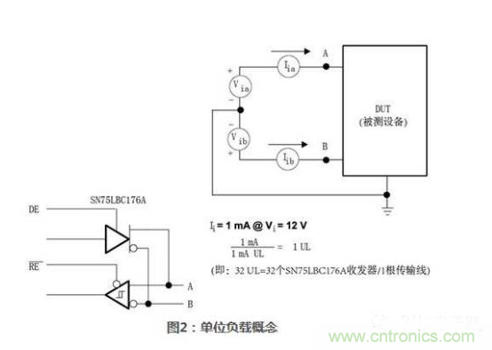 圖2給出了SN75LBC176A收發(fā)器單位負(fù)載計算的例子。因為這款設(shè)備將驅(qū)動器和接收器集成到一起構(gòu)成了收發(fā)器(即驅(qū)動器輸出和接收器輸入連接到了同一根總線上),因此很難分別獲取驅(qū)動器泄漏電流和接收器輸入電流。為了便于計算,將接收器輸入阻抗看作12 k?并給收發(fā)器1mA電流。這可以代表一個單位負(fù)載,一跟傳輸總線上允許32個這樣的負(fù)載。