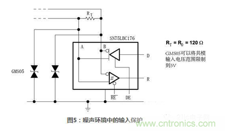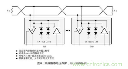 電流隔離能夠提供更好的系統(tǒng)級保護,但是價格也更高。更流行并且比較便宜的方案是使用二極管保護。使用二極管方法代替電流隔離是一種折衷方法,在更低層次上提供保護。外接二極管和內(nèi)部集成瞬態(tài)保護二極管的例子如下圖所示:圖5所示485收發(fā)器SN75LBC176外接二極管來防止瞬態(tài)毛刺。