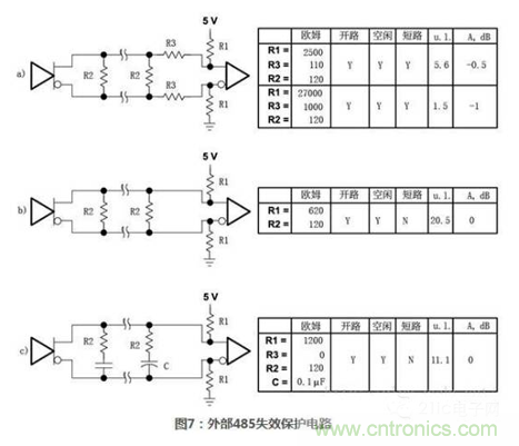使用這樣的內(nèi)部上下拉電阻允許總線不進行終端匹配,但是會顯著的降低最大信號速率和可靠性。圖7給出了一些485接口通用外置失效保護電路,每個電路都盡力維持接收器輸入端電壓不小于最小臨界值并在一個或多個故障條件(開路、空閑、短路)下,維持一個已知的邏輯狀態(tài)。