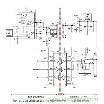 此外,使用低功耗計數(shù),可以使用小型隔離變壓器。如圖9所示,收發(fā)器使用SN65HVD10,當(dāng)然任何TI公司3.3V或5V RS485收發(fā)器、3.3-V TIA/EIA-644 LVDS或者3.3-V TIA/EIA-899 M-LVDS收發(fā)器都可以使用這個電路。2.4.2操作原理圖9所示的例子可用于3.3V或5V,電源使用變壓器隔離,數(shù)據(jù)信號采用數(shù)字隔離器隔離。因為485收發(fā)器需要隔離電源,可調(diào)LDO穩(wěn)壓器必須被隔離。