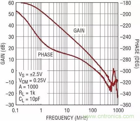 圖 2 顯示了 LTC6268 放大器隨頻率變化的開環(huán)增益和相位響應(yīng)。LTC6268是一款小巧的小型低噪聲 500MHz 放大器,具軌至軌輸出和僅 3fA 偏置電流,可以作為一個很好的例子來說明真實放大器的行為表現(xiàn)。主極點補償?shù)?–90° 相位滯后約從 0.1MHz 開始,在 8MHz 左右達到 –270°,超過 30MHz 時則下移超過 –270°。實際上,除了由于額外增益級和輸出級所引起的基本主導(dǎo)補償滯后之外,所有的放大器都具有高頻相位滯后。通常,額外相位滯后的起點在 GBF/10 左右。
