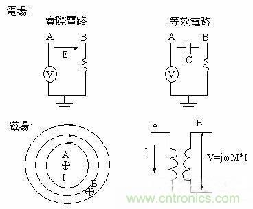 就Maxwell方程式的大多數(shù)應(yīng)用而言,噪聲耦合方法可以代表等效組件的模型。例如:在兩個(gè)導(dǎo)體之間的一個(gè)時(shí)變電場(chǎng),可以代表一個(gè)電容。在相同的兩導(dǎo)體之間,一個(gè)時(shí)變磁場(chǎng)可以代表互感(mutual inductance)。附圖二表示這兩種噪聲耦合機(jī)制。