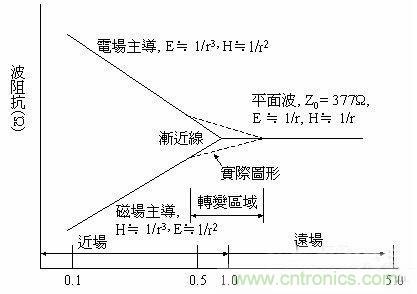 近場(chǎng)(near field)(磁和電的成份)和遠(yuǎn)場(chǎng)的關(guān)系,如附圖一所示。所有的波都是磁場(chǎng)和電場(chǎng)成份的組合。這種組合稱(chēng)作「PoynTIng向量」。實(shí)際上,是沒(méi)有一個(gè)單獨(dú)的電波或磁波存在的。我們之所以能夠測(cè)量到平面波,是因?yàn)閷?duì)一個(gè)小天線(xiàn)而言,在距離來(lái)源端數(shù)個(gè)波長(zhǎng)的地方,其波前(wavefront)看起來(lái)像平面一樣。