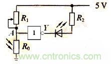 隨著城市化進(jìn)程的加快發(fā)展,城市建設(shè)也趨于現(xiàn)代化、人文化、科技化,城市道路兩旁的路燈也成了一座城市獨(dú)特的風(fēng)景線,其自動(dòng)控制不但節(jié)省人力,還節(jié)約了能源。如圖所示是自動(dòng)控制路燈的邏輯電路原理圖,其中R0是光敏電阻,光越強(qiáng)烈,光敏電阻R0的阻值越小,R1與R0串聯(lián)時(shí)所分的電壓就越小,A點(diǎn)輸入低電位,通過非門后,輸出端Y為高電位,所以路燈自動(dòng)熄滅。光越微弱,光敏電阻R0的阻值越小,R1與R0串聯(lián)時(shí)所分的電壓就越大,A點(diǎn)輸入高電位,通過非門后,輸出端Y為低電位,所以路燈自動(dòng)接通。