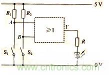 汽車給人們的出行帶來方便、舒適,但其安全性也很重要。如圖所示為簡單的車門報(bào)警電路圖。圖中的兩個(gè)按鈕開關(guān)S1、S2分別裝在汽車的兩道門上。駕駛員離開汽車時(shí),兩車門均處于關(guān)閉狀態(tài),跟兩車門對(duì)應(yīng)的開關(guān)S1、S2均閉合,即輸入邏輯均為0,那么輸出也是邏輯0,電流不通過發(fā)光二極管,這時(shí)發(fā)光二極管不會(huì)發(fā)光報(bào)警;只要其中任何一個(gè)車門打開時(shí),S1或S2就處于斷開狀態(tài),即輸入為邏輯1,那么輸出也是邏輯1,這時(shí)就有電流通過發(fā)光二極管,使其發(fā)光報(bào)警。如果有四個(gè)門,原理也是一樣,通過指示燈發(fā)光報(bào)警就可以判斷門是否都關(guān)好了。