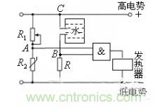 許多家庭都安裝了電熱水器,它給人們的生活帶來了方便。如圖所示是電熱水器系統(tǒng)的恒溫器集成電路。R1為調(diào)溫電阻,R2為熱敏電阻。“與”門電路的兩個(gè)輸入端分別接上一個(gè)水位傳感器和一個(gè)水溫傳感器。當(dāng)水箱充滿水時(shí),B點(diǎn)為高電壓(即輸入為邏輯1),R2為熱敏電阻,溫度越低,熱敏電阻的阻值越大,兩端的分壓越大,當(dāng)電壓達(dá)到一定程度時(shí),A點(diǎn)為高電壓(即輸入為邏輯1),當(dāng)A和B都為高電壓時(shí),“與”門的輸出端為高電壓,電熱水器的加熱開關(guān)才會(huì)接通電源,對(duì)水箱中的水進(jìn)行加熱。當(dāng)溫度高于一定溫度時(shí),R2的電阻變小,R2兩端的電壓變小,發(fā)熱器停止加熱,所以熱水器處于保溫狀態(tài)。當(dāng)水箱水不滿時(shí),或者溫度高時(shí)發(fā)熱器都不會(huì)加熱。