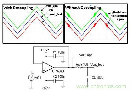 圖 1 為帶去耦電容器和不帶去耦電容器(C1 和C2)情況下用于驅(qū)動 R-C 負(fù)載的緩沖電路。我們注意到,在不使用去耦電容器的情況下,電路的輸出信號包含高頻 (3.8MHz) 振蕩。對于沒有去耦電容器的放大器而言,通常會出現(xiàn)穩(wěn)定性低、瞬態(tài)響應(yīng)差、啟動出現(xiàn)故障以及其它多種異常問題。