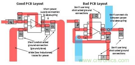 圖 3 將良好的去耦合板面布局與糟糕的布局進(jìn)行了對比。您應(yīng)始終嘗試著讓去耦合連接保持較短的距離,同時避免在去耦合路徑中出現(xiàn)通孔,原因是通孔會增加電感。大部分產(chǎn)品說明書都會給出去耦合電容器的推薦值。如果沒有給出,則可以使用 0.1uF。
