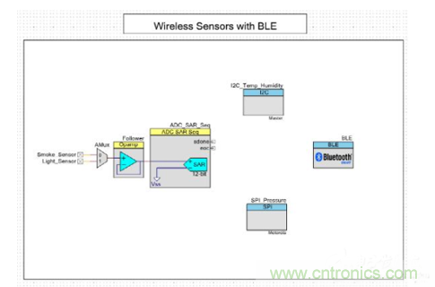 內(nèi)置BLE功能的處理器的靈活性和豐富資源,使傳感器能夠與單一BLE設(shè)備連接。圖2是使用PSoC Creator的典型配置。PSoC Creator是一個(gè)用于圍繞PSoC架構(gòu)開(kāi)發(fā)應(yīng)用程序的IDE。圖中顯示的是模擬和數(shù)字傳感器接口以及BLE子系統(tǒng)。該配置展示的是用于感測(cè)煙霧、光照強(qiáng)度、溫度、濕度和壓力的典型工業(yè)數(shù)據(jù)監(jiān)測(cè)系統(tǒng)。配置中的每個(gè)組件都有一個(gè)關(guān)聯(lián)的應(yīng)用程序編程接口(API),開(kāi)發(fā)人員可根據(jù)需要訪問(wèn)這些組件。每個(gè)組件還有一個(gè)與其相關(guān)的數(shù)據(jù)表對(duì)組件的可用配置進(jìn)行說(shuō)明。