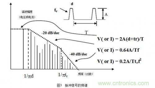 在EMC中,除了基本頻率外,還需考慮諧波因素,通常取十倍頻,但在數(shù)字電路中卻有些不同,比如在時(shí)鐘電路和邏輯門電路中,輻射帶寬與數(shù)字信號(hào)的上升沿或下降沿有關(guān)系,而不是數(shù)字信號(hào)的重復(fù)周期,其關(guān)系為:rtF?/1max?,其中rt是脈沖的上升沿時(shí)間。例如,典型時(shí)鐘驅(qū)動(dòng)的邊沿速率是2ns,此時(shí),maxF≈160MHz,再考慮十倍頻,則此時(shí)鐘電路可能產(chǎn)生直到1.6GHz的輻射帶寬。所以在選擇器件時(shí)要選擇慢速的邏輯器件系列,因?yàn)槠骷?duì)電磁輻射貢獻(xiàn)的大小與工作頻率無直接關(guān)系而只取決于邊沿速率(這和從電路功能設(shè)計(jì)上選擇快速器件是矛盾的,在電路設(shè)計(jì)時(shí)需要折中考慮)。還有從器件的抗擾能力上來說,CMOS器件是最好的,因?yàn)樗脑肼暼菹薷?。從封裝上來說,BGA是最好的,因?yàn)樗囊€很短。脈沖信號(hào)的頻譜如圖3所示。