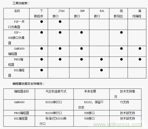 編程器型號(hào)有GANG430(RS232串行接口,串口、1拖8,支持JTAG、SBW,不支持BSL),PRGS430-IIIA多功能編程器(支持JTAG、SBW、BSL),這些編程器都可以做離線燒寫,并且支持燒寫熔絲,即脫離計(jì)算機(jī)來對目標(biāo)板燒寫,其中PRGS編程器還支持序列號(hào)燒寫方式。另還有專門的BSL編程器,只支持BSL接口,不支持燒寫熔絲。