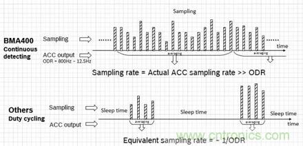可是,如我們前述“加速度傳感器在物聯(lián)網(wǎng)應(yīng)用中扮演重要角色”,傳感性能決定了系統(tǒng)能否基于傳感器做出精準的識別和決策。為了提高對原始信號的有效采集,并降低噪聲及高頻信號的干擾(混疊Aliasing),BMA400在正常工作模式下,采用了連續(xù)采樣和滑動低通濾波的方式。