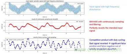 下圖顯示了連續(xù)采樣(continuous sampling)和周期休眠(duty cycling)兩種不同的采樣模式對于高頻噪聲的抗干擾能力的顯著區(qū)別。