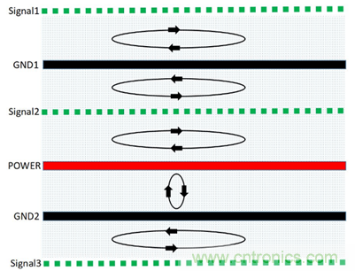 (1)由于信號層與回流參考平面相鄰,S1、S2、S3相鄰地平面,有最佳的磁通抵消效果,優(yōu)選布線層S2,其次S3、S1。