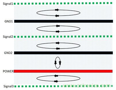 根據(jù)麥克斯韋方程,分立的帶電體或電流,它們之間的一切電的及磁的作用都是通過它們之間的中間區(qū)域傳遞的,不論中間區(qū)域是真空還是實體物質。在PCB中磁通總是在傳輸線中傳播的,如果射頻回流路徑平行靠近其相應的信號路徑,則回流路徑上的磁通與信號路徑上的磁通是方向相反的,這時它們相互疊加,則得到了通量對消的效果。