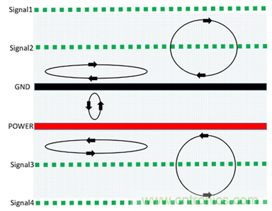 PCB疊層EMC規(guī)劃與設計思路的核心就是合理規(guī)劃信號回流路徑,盡可能減小信號從單板鏡像層的回流面積,使得磁通對消或最小化。