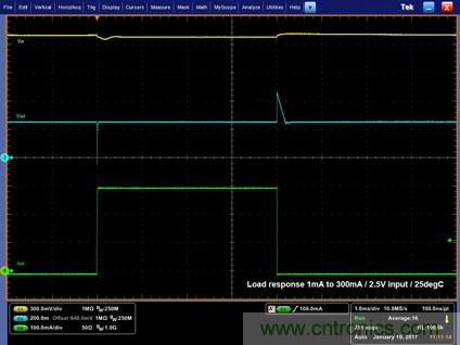 a) 由于有限的控制回路速度,負載電流的快速變化會導(dǎo)致輸出電壓的變化。有時內(nèi)部調(diào)節(jié)回路無法對電流的快速變化(由于時間延遲)作出反應(yīng),就會導(dǎo)致通常約為幾十毫伏(mV)的下沖/過沖。