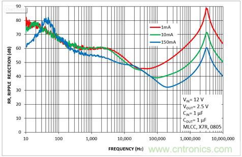 b)輸入電壓的快速變化(通常是由DC-DC轉(zhuǎn)換器的輸出電壓紋波引起的)無法通過控制回路完全過濾,于是輸入電壓的變化會一定程度地反映在輸出電壓中,該參數(shù)稱為電源抑制比(PSRR),且通常是頻變參數(shù)。一些制造商標示的PSRR為負數(shù),有些則為正數(shù)。一般而言,PSRR絕對值越高,從輸入到輸出的傳輸干擾信號就越少。通常情況下,受到干擾的輸入電壓會以mV或更低的單位級別傳輸至輸出端。相似地,輸入電壓的快速變化(即“線路瞬態(tài)響應(yīng)”)可發(fā)生于LDO輸出端。