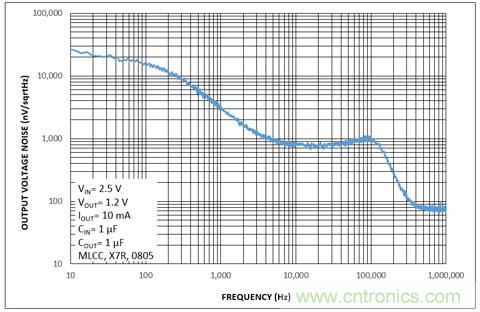 c)半導(dǎo)體結(jié)構(gòu)自身會產(chǎn)生固有的噪聲,主要是由自由原子與基礎(chǔ)材料晶體結(jié)構(gòu)碰撞而引起。由于固有噪聲是一種半導(dǎo)體中與電流傳導(dǎo)原理相關(guān)的物理現(xiàn)象,因此可以通過一些技術(shù)來抑制,但是不可能將其徹底去除。現(xiàn)代LDO的輸出噪聲可以達到數(shù)以百計的微伏(uV)甚至更小,但是頂級LDO產(chǎn)生的噪聲就會達到微伏(uV)單位。